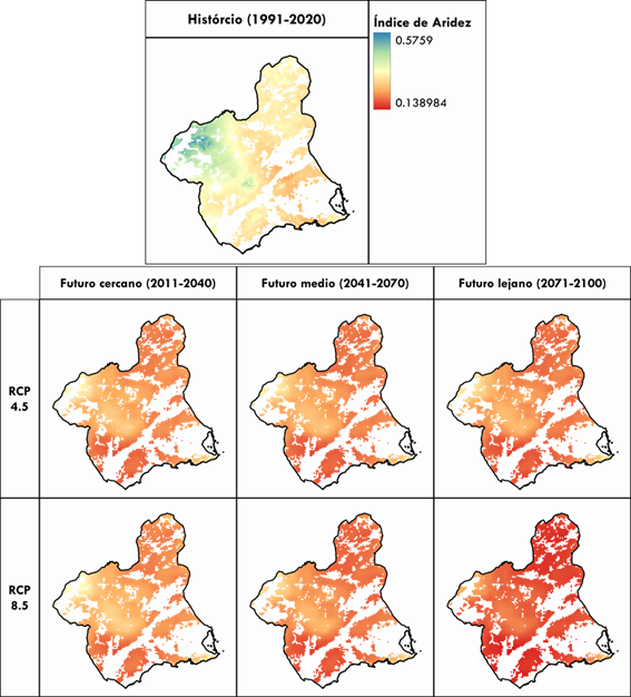 Figura 3. Comparación del índice de aridez histórico con proyecciones futuras del índice bajo diferentes horizontes temporales y escenarios de cambio climático.
