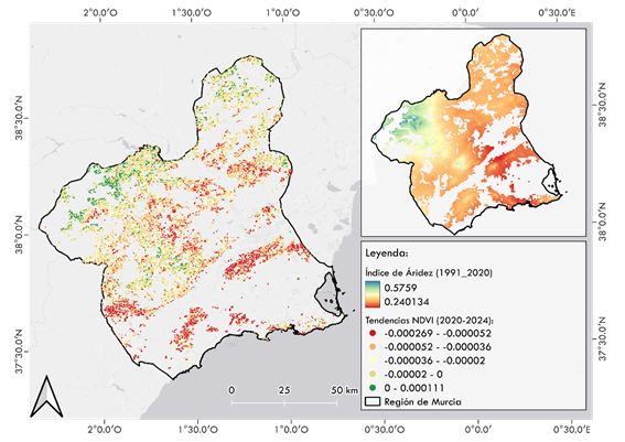 Figura 2. Tendencia del Índice de Vegetación de Diferencia Normalizada (NDVI, 2020-2024), en los pinares de Pinus halepensis en la Región de Murcia, comparada con el índice de aridez histórico (1991-2020). Fuentes: elaboración propia a partir de imágenes mensuales Landsat; Monitor de Aridez (Arretxea Iriarte et al., 2025).