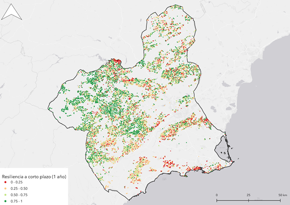 Con el fin de obtener un indicador comparable y estandarizado, se adoptó un enfoque de resiliencia a corto plazo, considerando un periodo de recuperación de un año posterior a la perturbación. Este intervalo permite evaluar la capacidad de los pinares para restablecer su funcionamiento en un marco temporal coherente con la dinámica interanual de las sequías mediterráneas.