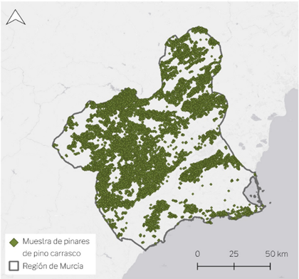 Figura 5. Distribución de los 11.285 puntos de muestreo sobre la distribución de los pinares de pino carrasco de la Región de Murcia.