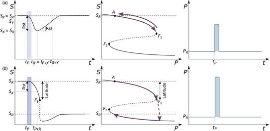 La Figura 4 muestra el modelo conceptual de resiliencia propuesto por Van Meerbeek et al. (2021), que representa el comportamiento de un sistema ante perturbaciones tipo pulso como lo es la sequía. En ella, la respuesta del sistema se describe mediante la variación de una variable de estado (S) en el tiempo (t). Cuando una perturbación (P) tipo pulso no supera la tolerancia del sistema (F1) (Figura 4a), este puede retornar a su condición inicial (SR), siendo la pendiente de esa recuperación (Rsl) un indicador de su resiliencia. Si la magnitud de la perturbación excede dicha tolerancia (Figura 4b), el sistema no logra regresar a su estado original y transita hacia un nuevo régimen (SR’).