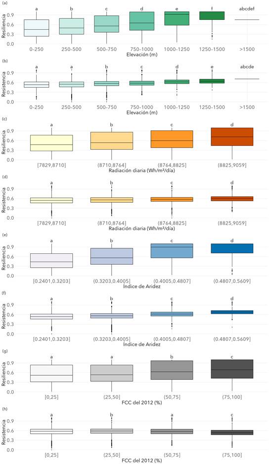 Figura 8. Comparación estadística de la resiliencia y la resistencia a corto plazo de los pinares de Pinus halepensesis según (a) y (b) rangos de elevación (m); (c) y (d) radiación diaria media en vernao (Wh/m2/día); (e) y (f) índice de aridez; y (g) y (h) FCC (%) previa a la perturbación. Grupos con la misma letra no difieren significativamente (p-valor > 0.05), mientras que letras distintas señalan diferencias significativas (p-valor ≤ 0.05).