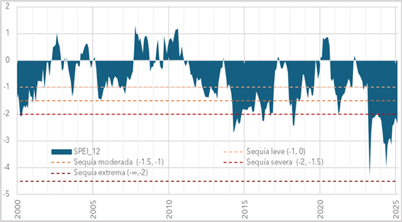 Figura 1. Serie temporal del índice SPEI-12 en la Región de Murcia (2000–2024). Fuente: SPEIbase v2.9 (Beguería et al., 2023).